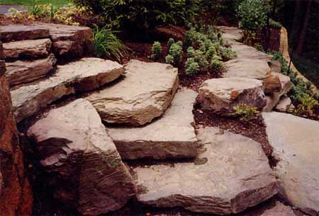 Shape ranges from flat to boulder with accent moss and fossil deposits. Size varies from two-man (100 lb.) to large landscape stones (3,000 lb.).